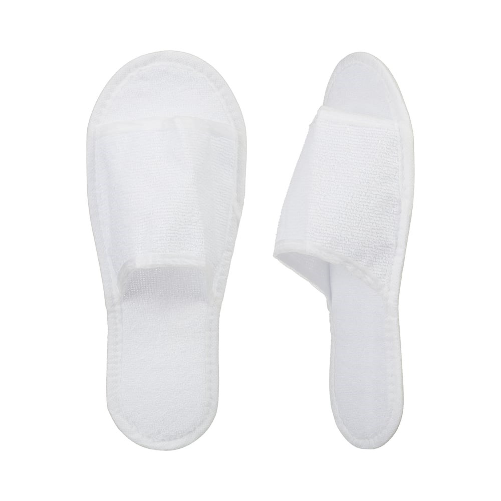 Одноразовые тапочки белого цвета с открытым мысом для гостиничных номеров, а также различных медицинских и косметологических учреждений. Предназначены для использования на сухих поверхностях. Верх из махровой ткани плотностью 200 г/кв.м. Подошва: изолон 4 мм. Имеют универсальный размер: 38-42. Продаются упаковками по 100 пар.