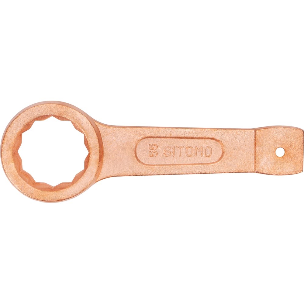 Двусторонний накидной ударный ключ предназначен для работ с резьбовыми соединениями в процессе ремонтных и монтажных работ. Инструмент выполнен из высококачественной стали, благодаря чему отличается прочностью и долговечностью. Омедненное покрытие обладает повышенной устойчивостью к высокотемпературному воздействию случайной искры. Ключ может применяться на предприятиях с наличием потенциально опасных сред, а также в быту. Одна из рабочих поверхностей ключа предназначена для ударных воздействий с целью увеличения усилия при работе с тугими крепежными соединениями.