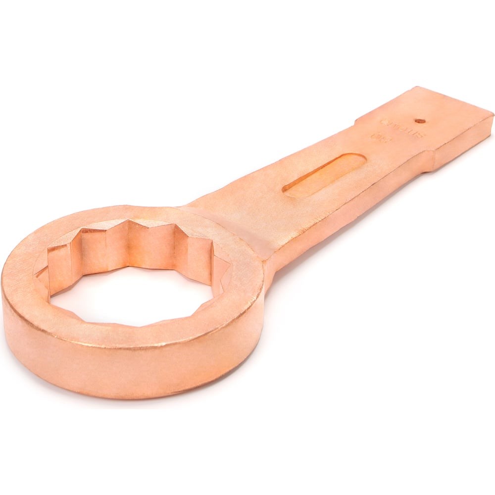 Двусторонний накидной ударный ключ предназначен для работ с резьбовыми соединениями в процессе ремонтных и монтажных работ. Инструмент выполнен из высококачественной стали, благодаря чему отличается прочностью и долговечностью. Омедненное покрытие обладает повышенной устойчивостью к высокотемпературному воздействию случайной искры. Ключ может применяться на предприятиях с наличием потенциально опасных сред, а также в быту. Одна из рабочих поверхностей ключа предназначена для ударных воздействий с целью увеличения усилия при работе с тугими крепежными соединениями.