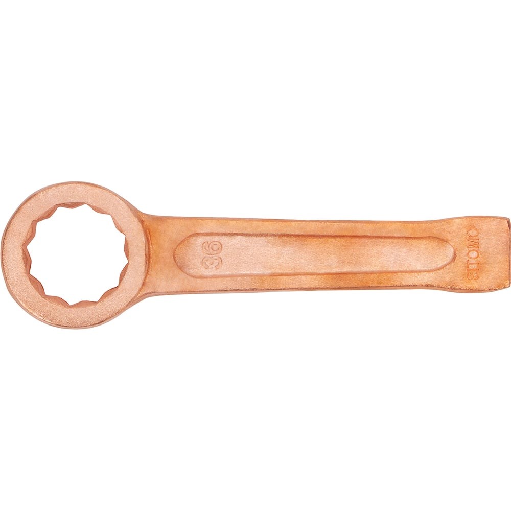 Двусторонний накидной ударный ключ предназначен для работ с резьбовыми соединениями в процессе ремонтных и монтажных работ. Инструмент выполнен из высококачественной стали, благодаря чему отличается прочностью и долговечностью. Омедненное покрытие обладает повышенной устойчивостью к высокотемпературному воздействию случайной искры. Ключ может применяться на предприятиях с наличием потенциально опасных сред, а также в быту. Одна из рабочих поверхностей ключа предназначена для ударных воздействий с целью увеличения усилия при работе с тугими крепежными соединениями.