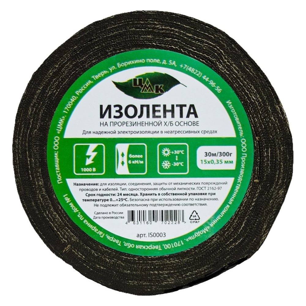Изолента ЦМК Х/Б, 15 мм х 30 м, односторонняя, черная, 300 г IS0003 предназначена для изоляции, соединения, цветной маркировки и защиты от механических повреждений проводов и кабелей. Дополнительные технические характеристики: Материал: хлопчатобумажная лента на клеевой резиновой основе. Напряжение: до 1000В Высокая устойчивость при растяжении.