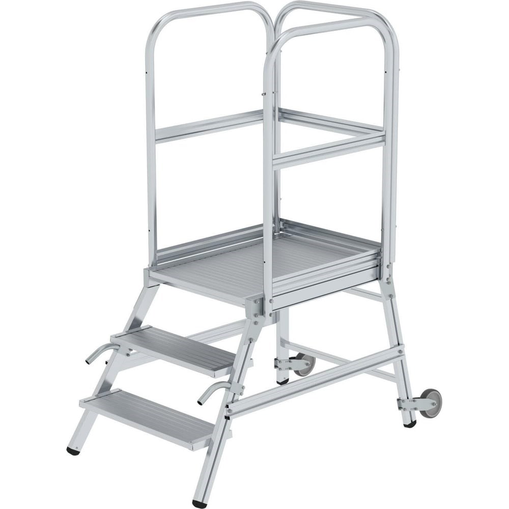 Односторонняя платформа с колесами и ручкой 3 ступени из алюминия Munk 056103 представляет собой супер прочную технику, которая позволит вам решать много задач разной сложности. Материалом для конструкции служит алюминий, отличающийся повышенной износостойкостью. Особенность данной лестницы с платформой - наличие ручки для удобства перемещения конструкции. Максимального удобства в использовании техники позволяют добиться подпружиненные колеса. Для комфортного подъема, пуска и проведения работ на лестнице есть ступени и площадка выполнены из рифленого алюминия.Регулярные нагрузки во время эксплуатации лестничного оборудования могут негативно сказываться на общем самочувствии рабочего: появляются боли в позвоночнике и поясничном отделе. Избежать переутомления при перемещении лестниц можно за счет использования колес, которые фиксируются на опорных стойках.Для этой модели предусмотрено четыре самофиксирующихся поворотных ролика.Каждый из них составляет 125 миллиметров в диаметре. Колеса оснащены фиксирующими устройствами (2 шт.).На конструкции предусмотрены прочные ступеньки шириной 200 мм. Параметры площадки составляют 600 x 800 мм.Данная рабочая платформа поставляется разобранной. Подробные рекомендации о ее сборке можно прочесть в инструкции. Согласно DIN EN 131-7, поручни с обеих сторон не являются обязательными на платформенных лестницах, угол подъема которых составляет 60° и более.