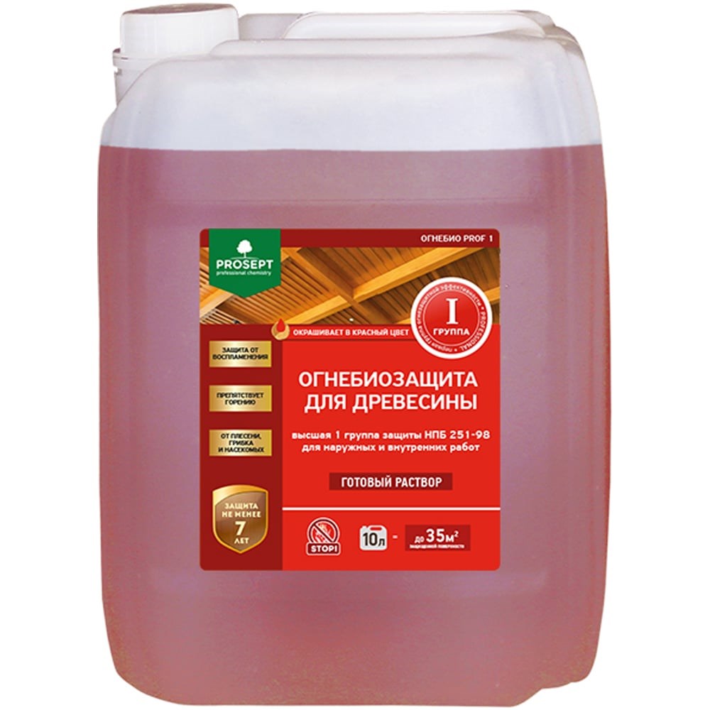 Огнебиозащита для древесины PROSEPT ОГНЕБИО PROF 1, 1 группа 10 л 007-10 имеет обязательный пожарный сертификат. Может использоваться внутри помещений и на открытом воздухе. Пропитка защищает от возникновения и распространения огня, а также от воздействия насекомых и грибков. Переводит древесину в трудногорючий материал. Подходит для обработки как новых конструкций, так и ранее обработанных.Пропитка устойчива к старению, не высаливается и не выщелачивается.Не оказывает негативного воздействия на свойства древесиныНе изменяет ее структуруНе препятствует дальнейшей обработке, склеиванию и окраске любыми ЛКМ.При обеспечении невымываемости препарата, срок защиты составит не менее 7 лет.При воздействии высоких температур на обработанной древесине протекает химическая реакция с высоким поглощением тепла и выделением негорючих газов. Одновременно на поверхности древесины образуется огнестойкий теплоизоляционный слой, который перекрывает доступ кислорода, не дает возможность древесине поддерживать горение и достигнуть температуры воспламенения.Суммарный расход для обеспечения огнезащитных свойств по I группе (трудногорючая древесина) должен быть не менее 500 г/кв. м; по II группе (трудновоспламеняемая) — не менее 300 г/кв. м.Нанесение состава должно быть обильным и равномерным при температуре не ниже +5 градусов. Обработанную древесину следует защитить от попадания воды и атмосферных осадков.Не содержит канцерогенов. Обработанная поверхность безопасна для человека и животных.