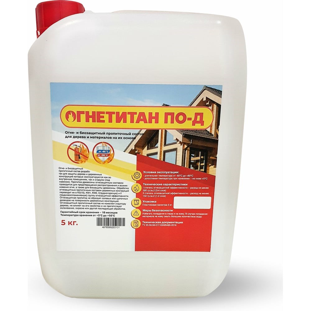 Огнебиозащита Огнетитан ПО Д 5кг БП-00000972 предназначена для обработки деревянных поверхностей и конструкций внутри и снаружи помещений (под навесом).Пропиточный состав предотвращает распространение и возникновение огня. Продукт после высыхания не образует солевых или щелочных разводов, не изменяет естественную структуру дерева, не влияет на его свойства, не ухудшает последующее склеивание или окрашивание.