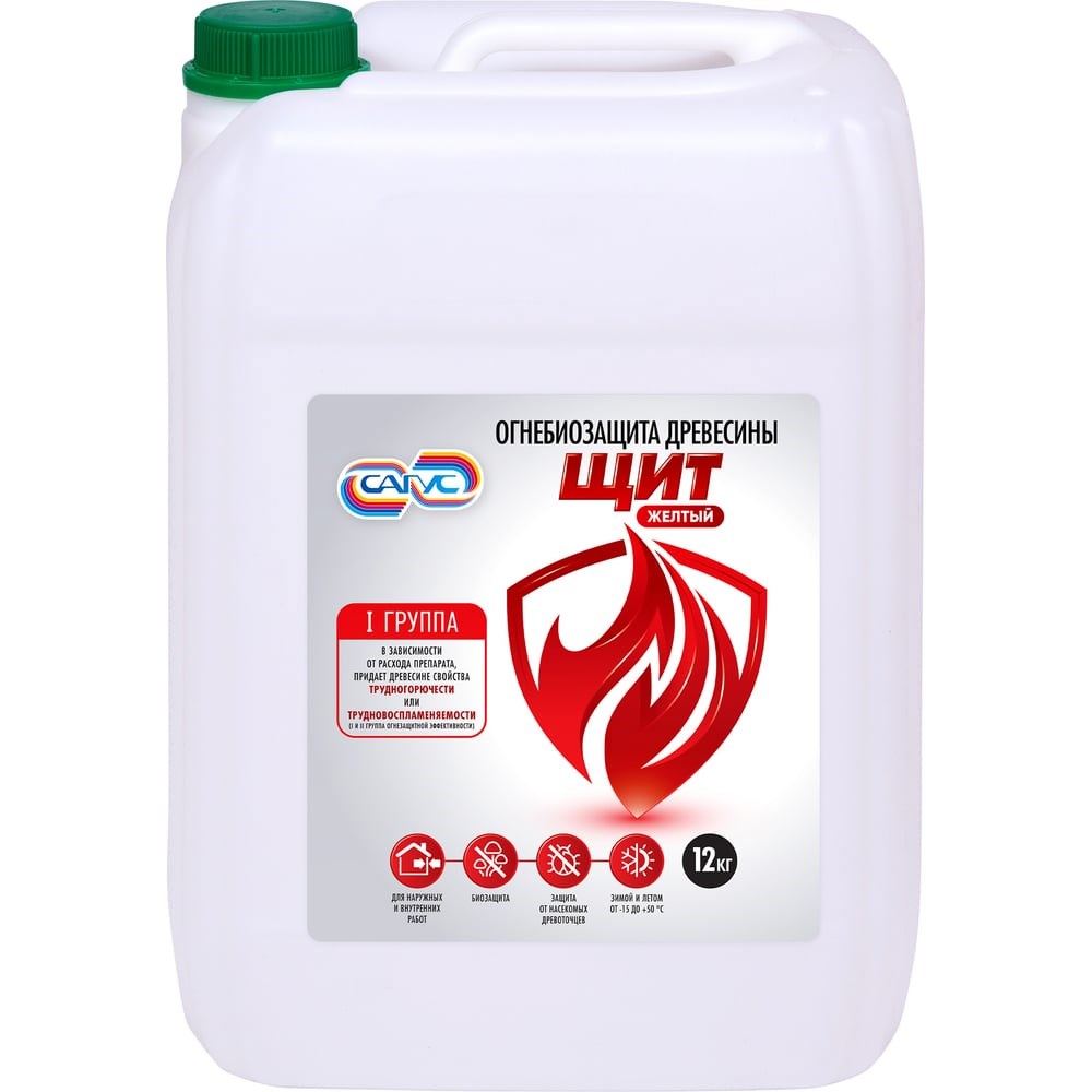 Огнебиозащитный состав ПЕРВОЙ ГРУППЫ огнезащитной эффективности для древесины и материалов на ее основе. Препарат соответствует требованиям пожарной безопасности, установленными в – ГОСТ Р 532192-2009 (1 группы огнезащитной эффективности) при расходе не менее 400г/м². Препарат применяется как поверхностно-пропиточное средство для защиты снаружи и внутри помещений от возгорания и биоразрушения. САГУС Щит обладает усиленными антисептическими свойствами, благодаря которым предохраняет древесину от плесневых и дереворазрушающих грибов. Огнебиозащита САГУС Щит позволяет проводить работы и летом, и зимой при температуре воздуха от -15°C до +50°C.Препарат готов к применению, разбавление его водой не допускается. Огнебиозащитная обработка деревянных конструкций должна производиться при температуре воздуха не ниже -15°C. При нанесении препарата в зимнее время на мерзлую древесину желательно, чтобы состав был «комнатной» температуры, т.е. +20-24°C. Наносят препарат на древесину методом распыления или кистью. Препарат наносят равномерно, без пропусков, тщательно обрабатывая трещины и места соединений элементов конструкций. Количество нанесений зависит в основном от породы древесины, шероховатости обрабатываемой поверхности, ее положения (вертикальная, наклонная, горизонтальная). Нанесение под защитно-декоративные пленочные препараты продлевает срок действия огнебиозащитной пропитки.Окрашивает древесину в ЖЕЛТЫЙ ЦВЕТ.