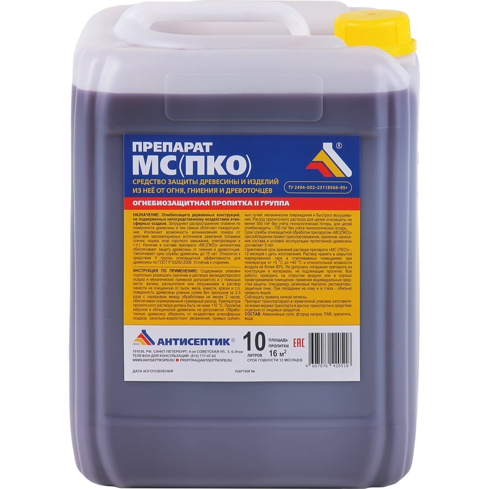 Огнебиозащитная пропитка ЗАО "Антисептик" МС (ПКО) 10 л 00-00003590 предназначена для обработки различных пород древесины, которые не подвергаются непосредственному воздействию атмосферных осадков. Состав наносится на деревянные конструкции, которые эксплуатируются внутри помещений (стропила, обрешетки кровли, ходовые мостики, подмости, строительные леса). Препарат относится к средствам II группы огнезащитной эффективности для древесины по ГОСТ Р 53292-2009.