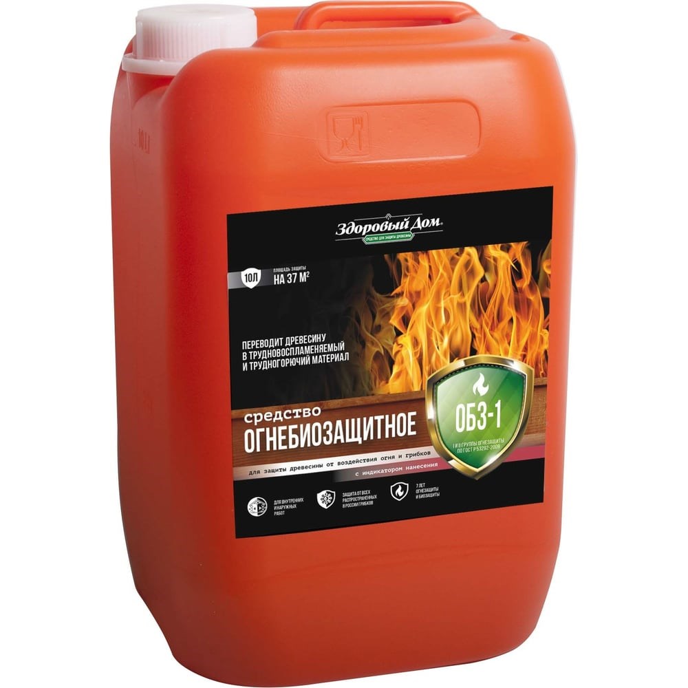Огнебиозащитное средство Здоровый дом ОБЗ-1 с индикатором, 10 л ЛА-00000229 - это эффективное средство для комплексной защиты древесины и материалов на ее основе от возгорания, распространения пламени и биоразрушения. В соответствие с требованиями НПБ 251-98 обеспечивает получение I и II группы огнезащитной эффективности. Продукт предотвращает рост и обеспечивает профилактическую защиту от появления грибков плесени, синевы, гнили. Обладает отпугивающим действием против насекомых-вредителей. Состав с индикатором цвета, что позволяет контролировать равномерное распределение средства. Расход (без учета потерь): 600 г/кв. м для обеспечения I (наивысшей) группы огнезащитной эффективности или 300 г/кв. м для обеспечения II (средней) группы огнезащитной эффективности, а также 300 г/кв. м для обеспечения биозащитных свойств. Нанесение в несколько приемов, обеспечивающих нормируемый расход состава.