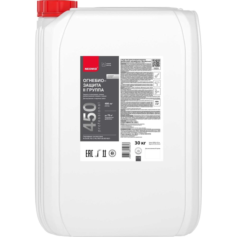 Огнебиозащитный состав NEOMID Неомид 450 - 2 группа (30 кг) Н-450(2)-30/гот. защищает древесину на срок до 7 лет от возгорания и распространения пламени, обеспечивая II группу огнезащитной эффективности согласно ГОСТ Р 53292 (переводя древесину в трудновоспламеняемый материал), и на срок 8-10 лет от гниения, возникновения плесени, при отсутствии контакта с влагой. Применяется как защитная пропитка для обработки деревянных стен, балок, стропильных систем, несущих брусьев, перекрытий, лаг, оконных и дверных блоков, а также других конструкций из древесины различного назначения. Огнебиозащитная пропитка не оказывает негативного воздействия на свойства древесины, не изменяет ее структуру и цвет, не препятствует дальнейшей обработке, склеиванию и окраске.