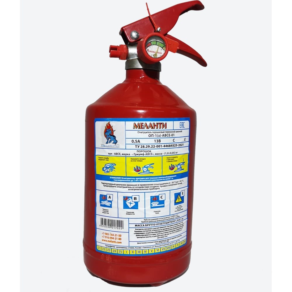 Огнетушитель Меланти ОП-1 з АВСЕ предназначен для первичного тушения пожаров и возгораний класса A, B, C, E (горючие и легковоспламеняющиеся жидкости, твердые горючие вещества и газы, электроустановки, не превышающие напряжение 1000 Вольт). Изделие подходит для оснащения различных объектов и помещений: административных зданий, жилых домов, офисов, гостиниц, промышленных участков и мн. др.