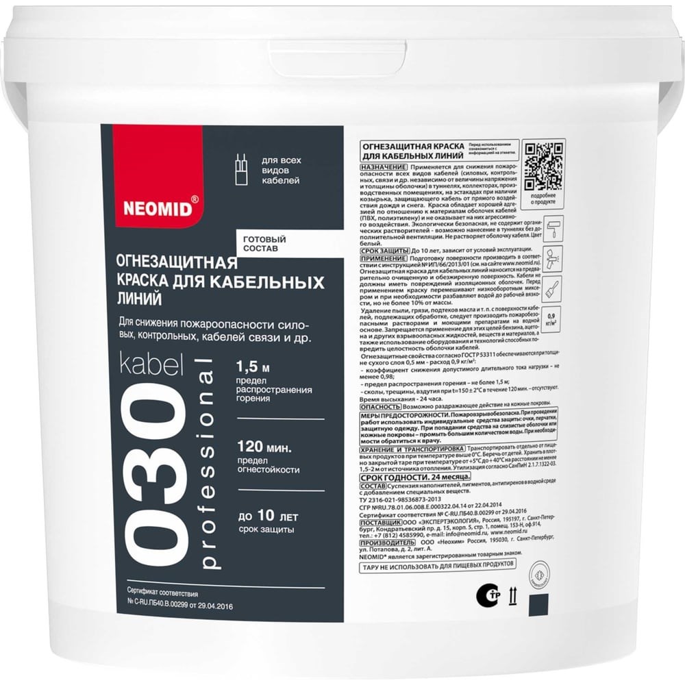 Огнезащитная краска для кабельных линий Neomid 6 кг Н-ОГНКРАСКА-КАБЛИН/6 предназначена для обработки силового кабеля независимо от величины напряжения и толщины оболочки. Продукт используют в туннелях, коллекторах и производственных помещениях. Состав образует защитный слой от ультрафиолета и атмосферных осадков. Покрытие не оказывает агрессивное воздействие на ПВХ и полиэтилен. Рекомендуемое количество слоев = 2-4