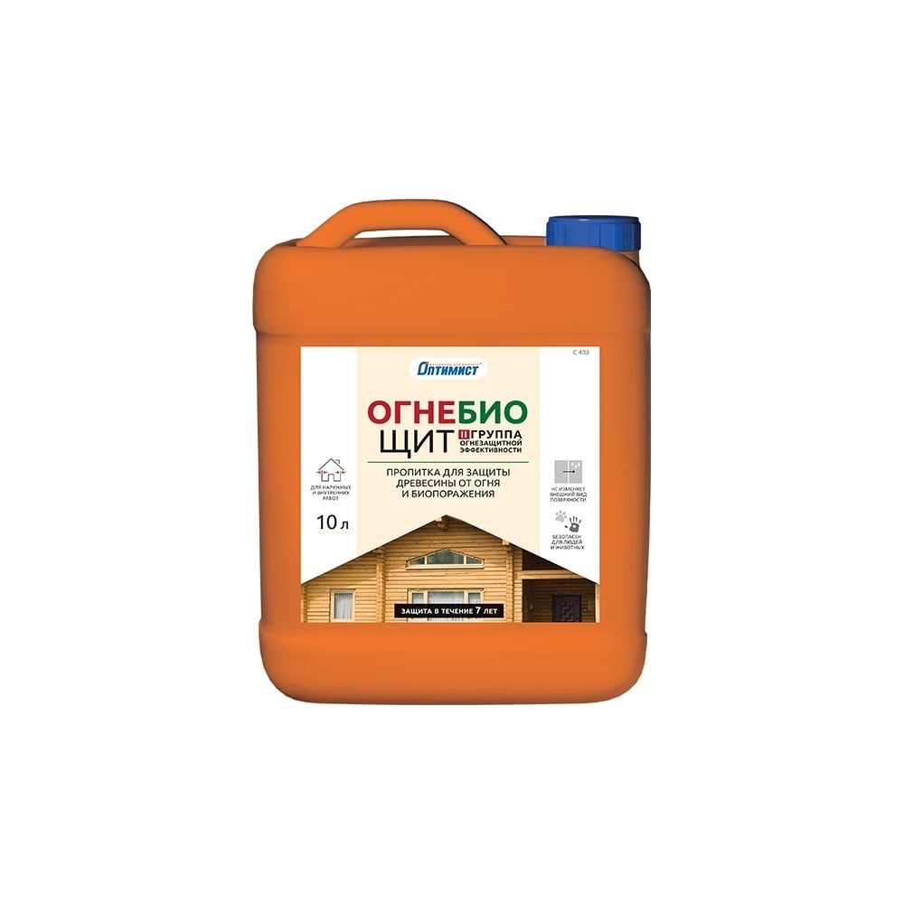 Огнезащитная пропитка Оптимист Огнебиощит бесцветный С403 10 л OPI016 предназначен для обработки деревянных поверхностей с целью получения трудновоспламеняемой древесины, предотвращения образования и развития гниения, синевы, плесени, грибка, заражения деревопоражающими насекомыми. Используется как для внутренних, так и для наружных работ (заборы, садовые постройки). Состав без запаха, не токсичен, экологически безопасен.