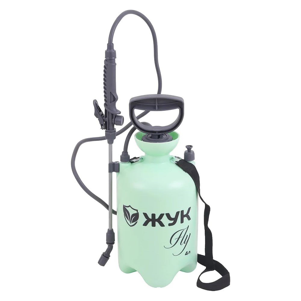 Плечевой пневматический опрыскиватель «Жук fly» предназначен для обработки растений, кустарников, деревьев средней высоты, огорода, а также для мытья стен, стекол и других хозяйственных работ. Особенностью модели является наличие цельнолитой заливной воронки, которая гарантирует герметичность и облегчает заливку жидкостей и сухих препаратов в опрыскиватель. Плечевой ремень, входящий в комплектацию, снимает напряжение с мышц спины во время эксплуатации. Также в опрыскивателе присутствуют подставка бака для устойчивости при эксплуатации, мерная шкала на баке, показывающая остаток содержимого и нетелескопический брандспойт 600 мм. С помощью насоса создаётся давление в баке, распыл жидкости осуществляется нажатием на клавишу брандспойта, а фиксатор на нем позволяет удобно работать без удерживания кнопки. Регулировка струи дает возможность выбирать подходящий режим для защиты растений от вредителей или для полива — от сильной струи до легкого тумана. Дополнительную безопасность обеспечивает предохранительный клапан, который срабатывает при избыточном давлении в баке.