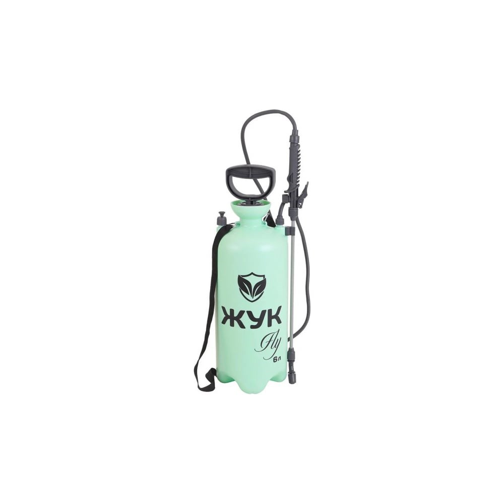 Плечевой пневматический опрыскиватель «Жук fly» предназначен для обработки растений, кустарников, деревьев средней высоты, огорода, а также для мытья стен, стекол и других хозяйственных работ. Особенностью модели является наличие цельнолитой заливной воронки, которая гарантирует герметичность и облегчает заливку жидкостей и сухих препаратов в опрыскиватель. Плечевой ремень, входящий в комплектацию, снимает напряжение с мышц спины во время эксплуатации. Также в опрыскивателе присутствуют подставка бака для устойчивости при эксплуатации, мерная шкала на баке, показывающая остаток содержимого и нетелескопический брандспойт 600 мм. С помощью насоса создаётся давление в баке, распыл жидкости осуществляется нажатием на клавишу брандспойта, а фиксатор на нем позволяет удобно работать без удерживания кнопки. Регулировка струи дает возможность выбирать подходящий режим для защиты растений от вредителей или для полива — от сильной струи до легкого тумана. Дополнительную безопасность обеспечивает предохранительный клапан, который срабатывает при избыточном давлении в баке.