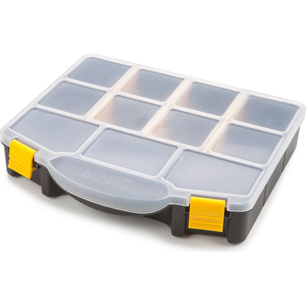 Органайзер Berossi Altera 220x190x40, черный АС 23205000 используется для хранения мелких вещей, инструментов и принадлежностей. При помощи перегородок, можно организовать внутреннее пространство по своему усмотрению. Органайзер можно использовать для хранения рыболовецких или рукодельных принадлежностей, предметов для рисования или катушек для швейных машин, а также болтов, гаек, шайб и многого другого. Удобная ручка является частью корпуса Качественный пластик отличается повышенной прочностью и стойкостью к внешним воздействиям Прозрачная гибкая крышка надежно крепится к основанию и прочно закрывается на две защелки На внутренней стороне крышки нанесены бороздки, которые в закрытом виде плотно прижимаются к перегородкам, что исключает перемешивание содержимого ячеек