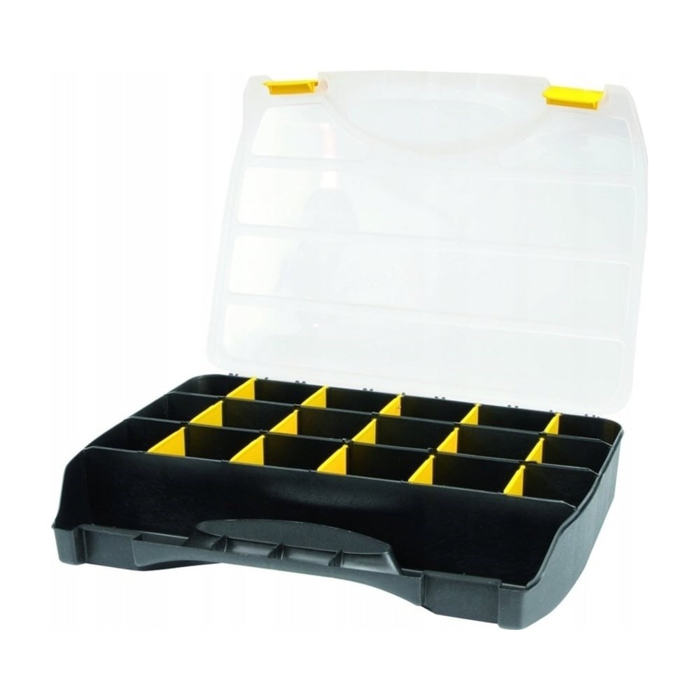 Регулируемый органайзер 36 x 27 см с ручкой для переноски и прочной застежкой. Изготовлен из пластика. Съемные внутренние стенки позволяют регулировать размер отсеков.Предназначен для хранения мелких предметов, например, мелкого крепежа, запасных частей и инструментов. Ручка обеспечивает удобную переноску. Пригодится дома, в гараже, мастерской и т.д.