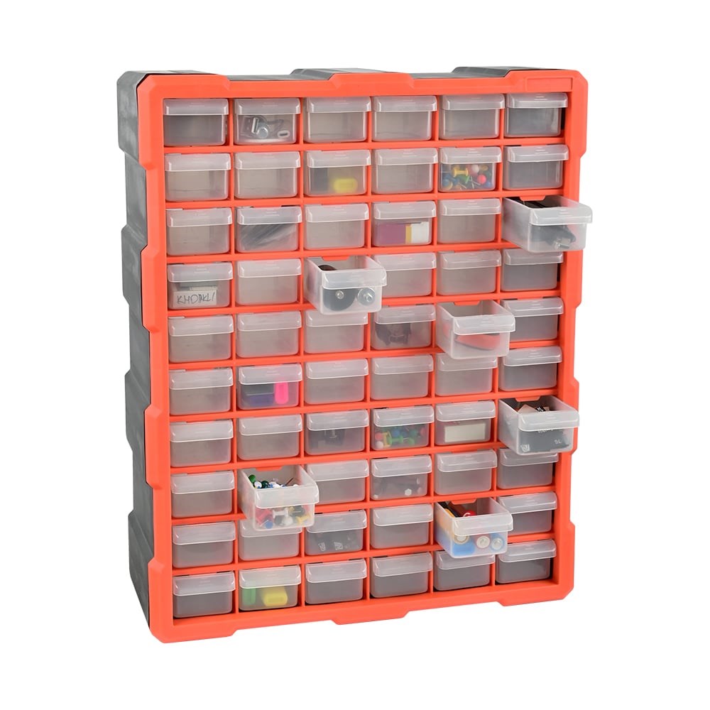 Органайзер для мелочей — это незаменимый помощник для организации порядка на рабочем столе мастера, в кабинете или гараже. Выдвижной органайзер состоит из 60 ячеек для хранения любых мелких предметов, включая инструменты, бисер и другие материалы для рукоделия, творчества, охоты, рыбалки, а так же различных крепежных элементов. Размер пластикового органайзера составляет 47,0х17х38.0 см, его можно использовать как настольный вариант либо крепить к стене с помощью саморезов. Размер выдвижного ящика 14х5х3,8 см. Органайзер для инструментов поможет сохранить порядок на рабочем столе и быстро найти нужный инструмент. Органайзер-кабинет станет отличным подарком для женщин, мужчин, детей и всех тех, кто любит, чтобы «все было по полочкам».