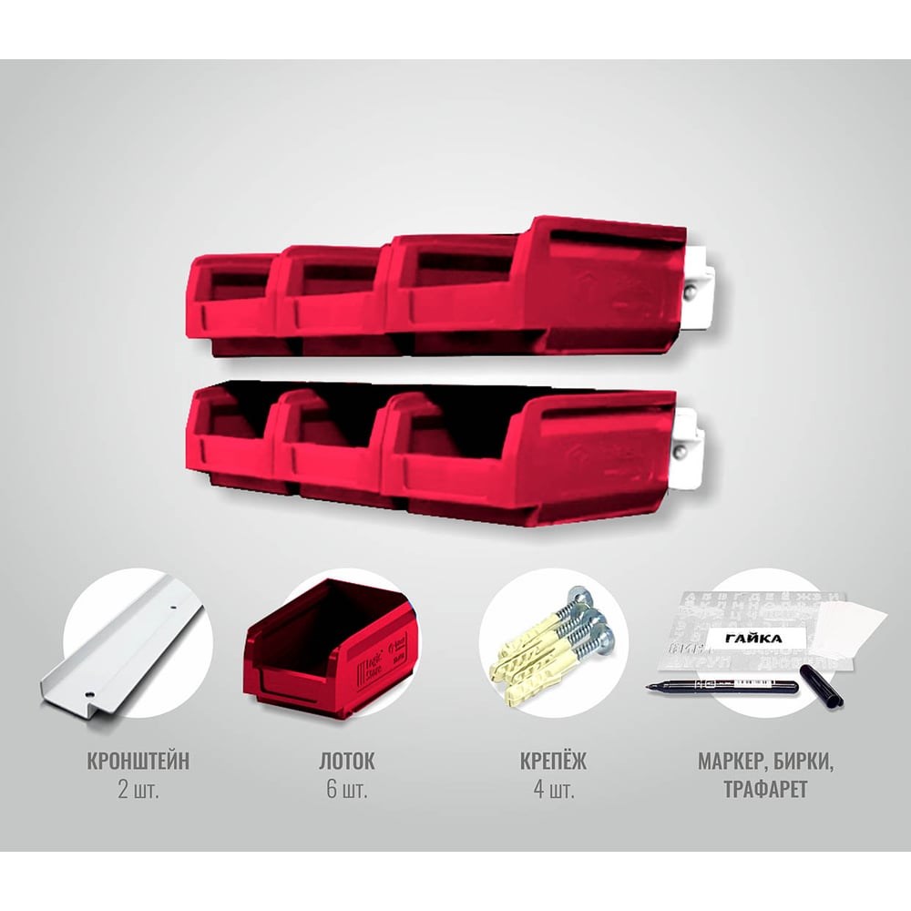 Надежный помощник в организации рабочего пространства мастерской и сборочного цеха. Вы не просто разложите все по своим местам, вы сможете дать им адреса, ведь все уже в комплекте. Представлен в виде двух независимых кронштейнов длиной 300мм, умещающих на себе по 3 лотка размером 165х100х75. Его размеры позволяют разместить точки хранения в очень ограниченном пространстве. Грузоподъемность каждого из лотков до 2,4кг в подвешенном состоянии. Грузоподъемность кронштейна до 50кг. Для вашего удобства органайзер укомплектован адресными бирками, маркером и трафаретом. Вам останется лишь прикрутить, разложить, подписать и порядок! Характеристикики: Тип: органайзер Материал: сталь + полипропилен Исполнение: настенное Цвет: белый + красный Габарит уп: 300х180х100мм Вес: 1 кг