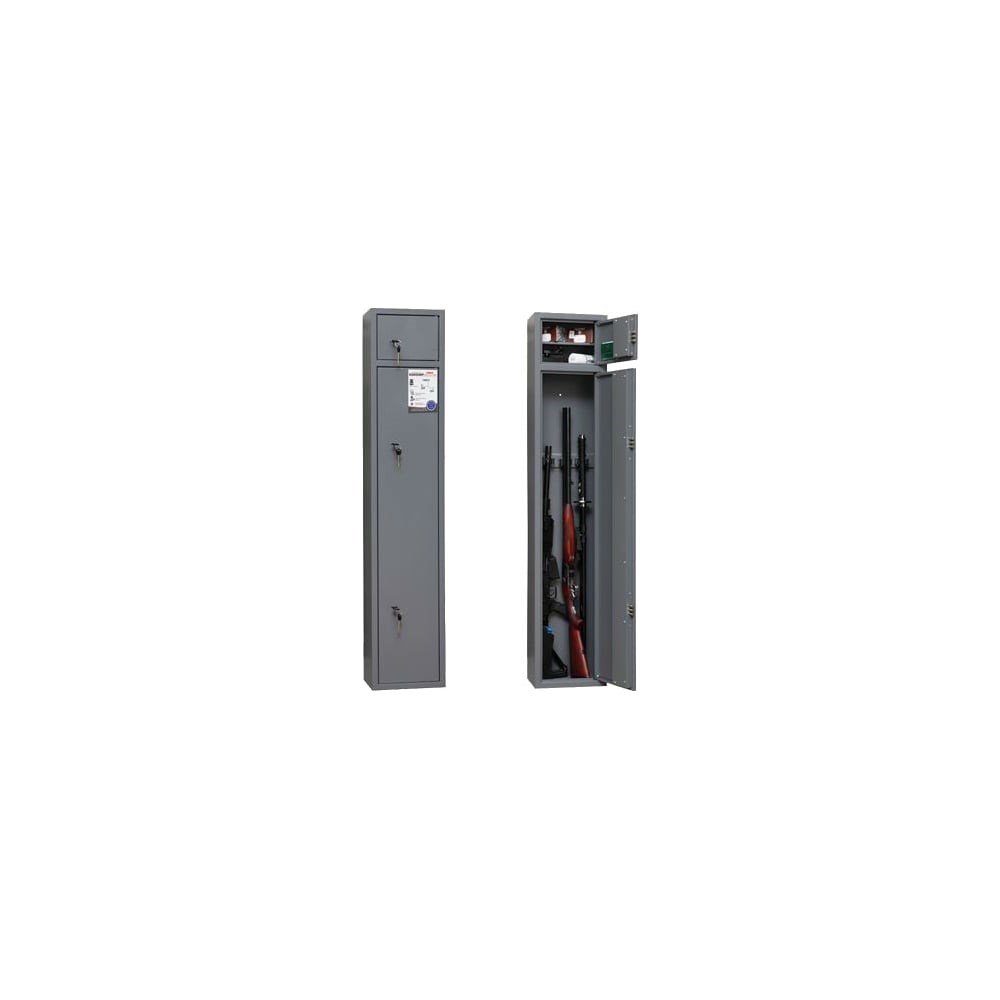 Оружейный шкаф Onix Канонир оснащен тремя ложементами для вертикальной фиксации до трех ружей одновременно. Шкаф предназначен для хранения оружия и патронов. Для патронов есть отдельный запираемый трейзер со съемной полкой. Конструкция выполнена из прочной стали и обладаетн тремя сувальдными замками, каждый их которых комплектуется двумя ключами. Сейф соответствует требованиям МВД РФ.