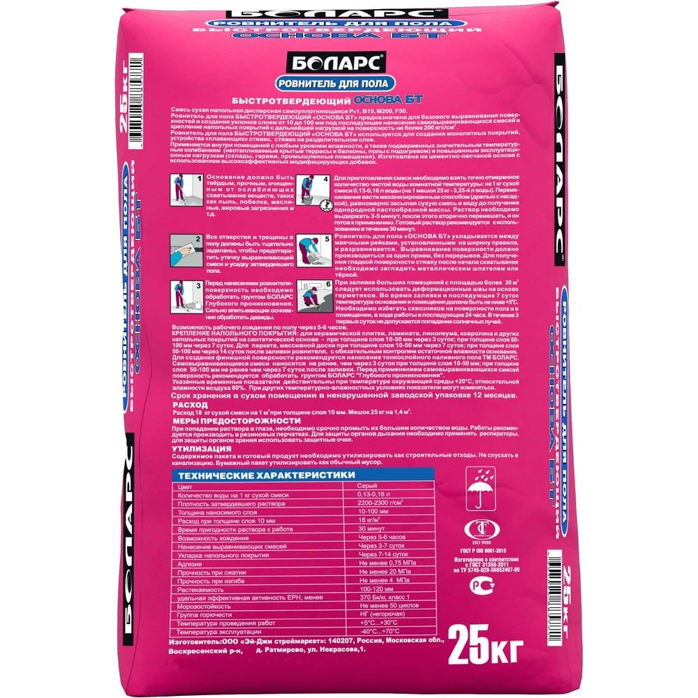 Основа-стяжка для пола БОЛАРС БТ 25 кг 00000014815 - Предназначен для базового выравнивания поверхностей и создания уклонов слоем 10-120 мм под последующее нанесение наливных полов и крепление напольных покрытий с нагрузкой на поверхность не более 250 кгс/см². Используется для создания монолитных покрытий, устройства «плавающих» стяжек, а также стяжек на разделительном слое. Подходит для помещений с любым уровнем влажности, а также оснований, подверженных значительным температурным колебаниям и повышенным эксплуатационным нагрузкам. Применяется для заливки полов ручным способом.Расход смеси зависит от рельефа основания. 18 кг/м² сухой смеси при толщине слоя 10 мм.