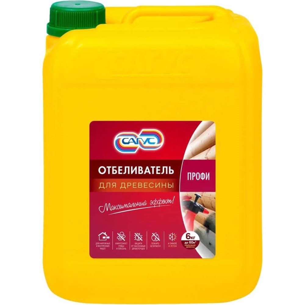 Отбеливатель древесины предназначен для быстрого глубокого отбеливания деревянных поверхностей, потемневших в результате грибных окрашиваний, воздействия атмосферных и временных факторов, УФ излучения, биопоражения различной природы, а также неправильной транспортировки и хранении.Область применения: отбеливатель **САГУС Профи** применяют на деревянных поверхностях, ранее не подвергавшихся обработке лакокрасочными материалами, внутри помещений и на открытом воздухе. Возможно применение препарата по бетону, плитке, камню, черепице, кирпичу и другим материалам для удаления плесени, мха, водорослей, лишайников и другие биопоражения.Работы необходимо проводить на открытом воздухе или в хорошо проветриваемом помещении с использованием средств индивидуальной защиты глаз и рук при температуре воздуха не ниже -20С. При случайном попадании состава в глаза или на кожу промыть большим количеством воды.Хранить и транспортировать отбеливатель **САГУС Профи** в прохладном и недоступном для детей месте при температуре не ниже -20С. Беречь от прямых солнечных лучей. Не допускать нагревания препарата. Срок хранения – 12 месяцев в оригинальной упаковке. Допускается использование по истечении срока годности с увеличением нормы расхода.