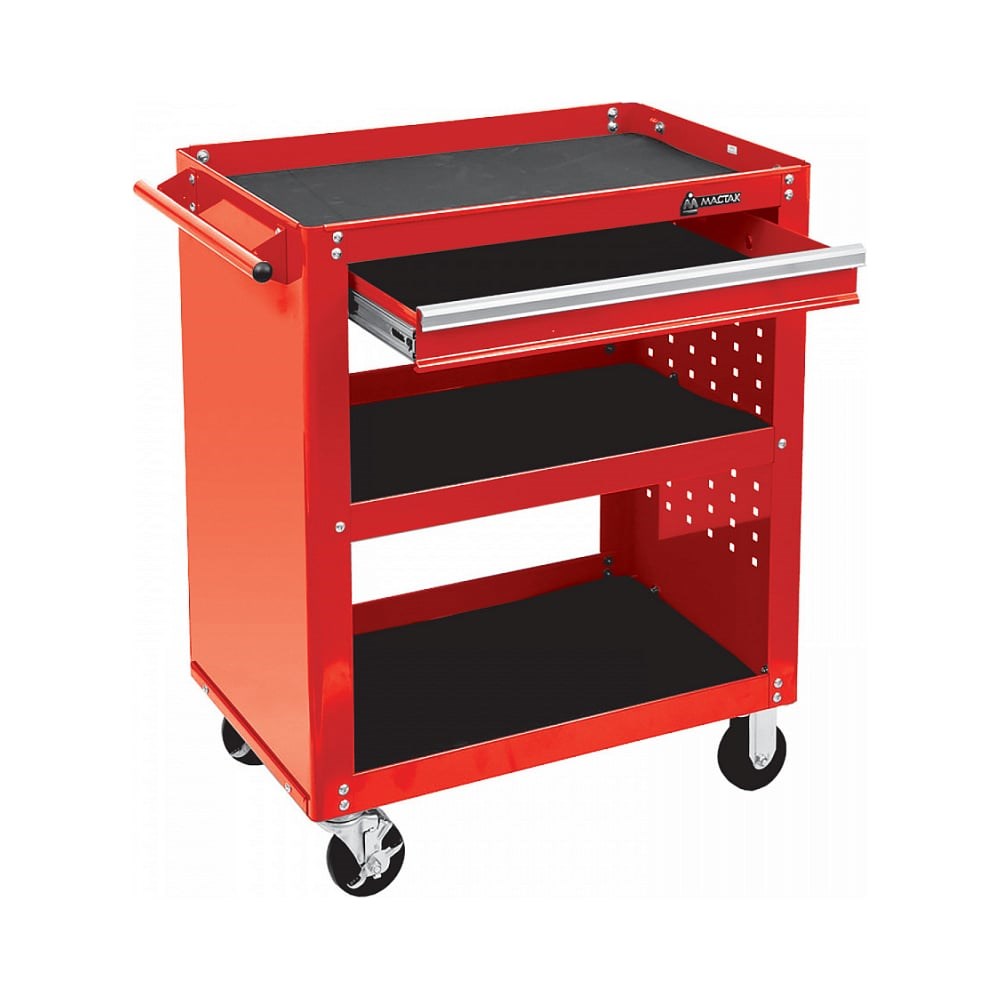 Открытая тележка МАСТАК ОПТИМА 3 полки и ящик, красная 520-01580MR предназначена для организации рабочего места в любом производственном помещении, станции технического обслуживания или авторемонтной мастерской. 3 открытые полки 1 выдвижная полка Перфорация на боковой панели для размещения инструмента Поворотные колеса снабжены тормозом Защитные коврики на полках Размер полок – 715 х 450 мм Размер выдвижной полки – 600 х 400 х 62 мм Общая грузоподъемность – 100 кг