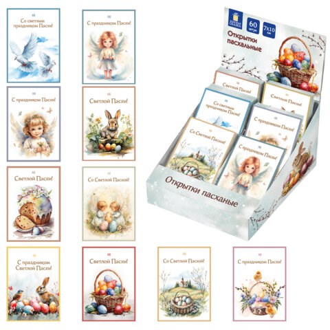 Открытки поставляются в 10 уникальных дизайнах - с изображением пасхальных яиц, цыплят, кроликов, куличами, ангелочков, цветочных мотивов и нежных весенних узоров (без возможности выбора).