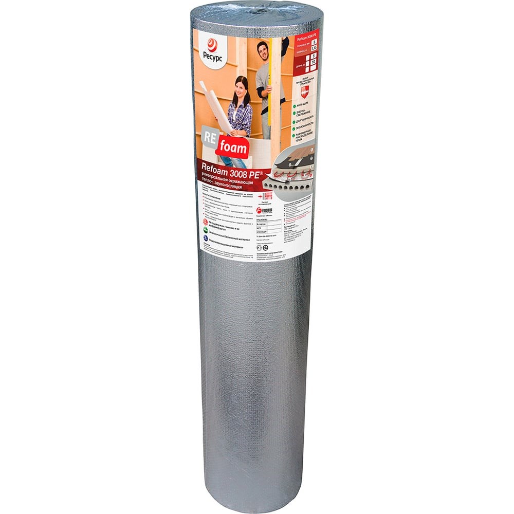 Отражающая изоляция под теплый пол Refoam 1,15м х 5м 20460 - профессиональный отражающий тепло-, паро и звукоизоляционный материал на основе сшитого пенополиэтилена, ламинированного лавсановой пленкой, обладающий повышеной стойкостью к деформации. Благодаря особой технологии производства структура материала приобретает поперечно-связанную модель, поэтому звукоизоляция «Рефом» отличается повышенной упругостью и устойчива к механическим нагрузкам. Обладает гидроизоляционными и теплоизоляционными свойствами. Применение: Отражающая подложка под пленочный "теплый пол"; Отражающая подложка под ламинат и паркет; Подкровельная тепло-, паро- и звукоизоляция; Тепло- и звукоизоляция трубопроводов и вентиляции, обшивка холодильных камер; Тепло- и звукоизоляция автотранспортных средств, фургонов и ж/д контейнеров. Материал не подвержен гниению и не деформируется, экологически безопасен, водонепроницаем.