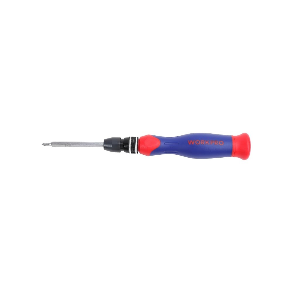 Прецизионная отвертка (14 бит) WP221057 Workpro• Вращающийся колпачок • Автоблокировка фиксирует любую биту с шестигранным хвостовиком • Набор из 7 двусторонних бит 75мм: PH000/SL1.5, PH00/SL2, PH0/SL2.5, PH1/SL3, T6/T7, T8/T9, H1.5/H2