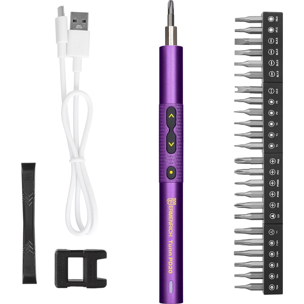 Электрическая отвертка в металлическом корпусе, с магнитным патроном. Работает от литий-ионного аккумулятора емкостью 350 мАч, который полностью заряжается через кабель USB примерно за 70 минут. На корпусе есть светодиодный индикатор зарядки. Отвертка комплектуется 24 битами из легированной стали S2: плоскими, шестигранными, шестилучевыми, крестовыми и т. д. Биты и отвертка поставляются в пластиковом футляре.Отвертка подходит как для несложного домашнего ремонта, так и для профессиональной работы в мастерских. Оснащена 3 светодиодами для работы при тусклом освещении или в темное время суток. Может вращаться в обе стороны (вперед или назад) со скоростью до 300 об/мин, крутящий момент составляет 0,3–0,45 Нм. После 2 минут работы мотор автоматически отключается, включить его снова можно нажатием кнопки на корпусе. Для защиты от поломки также предусмотрена задержка 0,1 с при прямом и обратном вращении.Отвертка Ermenrich Tunn PD20 удобна в использовании, в комплект поставки входит устройство для намагничивания и размагничивания.