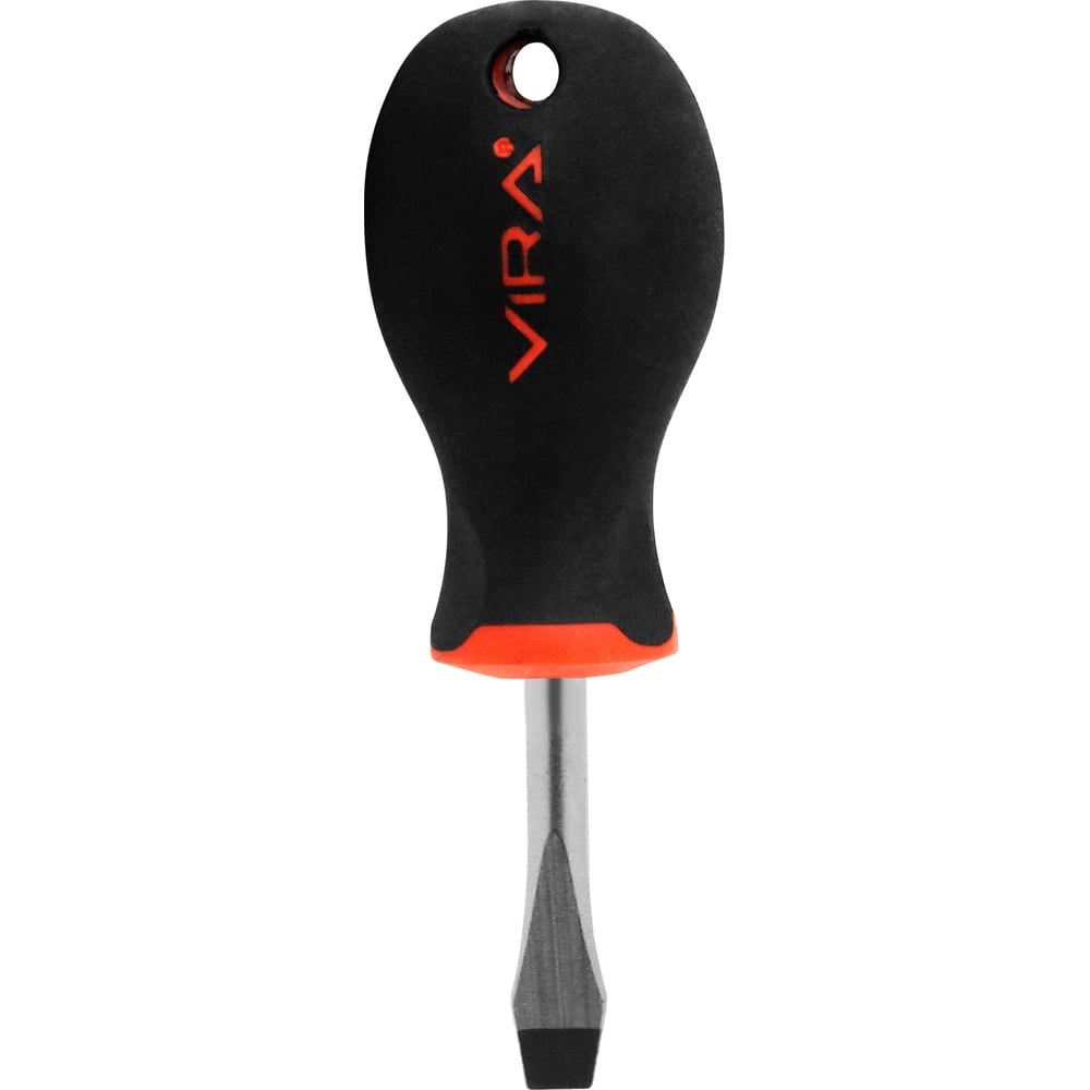 Отвертка шлицевая SL5X100 мм RAGE by VIRAОтвертка — это ручной инструмент, применяемый для откручивания и закручивания резьбовых крепежей, имеющих на головке шлиц. Стержень изготовлен из высококачественной легированной стали устойчивой к износу и истиранию с намагниченным наконечником. Геометрия жала соответствует промышленным стандартам. Двухкомпонентная рукоятка выполнена из пластикаABSи упругой резиныTPRделает ручку мягкой для вашей ладони и обладает антискользящим эффектом. Треугольная форма рукоятки снижает усталость при продолжительной работе и создает дополнительную опору при необходимости увеличения крутящего момента. Отвертка в два раза превосходит международный стандарт DIN по показателю предельного крутящего моментаХарактеристики:Тип шлица: SL5Ширина шлица (мм): 5Толщина шлица (мм): 0.8Длина жала (мм): 100Твердость (HRC): 48-52Материал жала: хромованадиевая сталь (CrV)Материал рукоятки: ABS-пластик, термопластичная резина (TPR)Особенность: магнитный наконечникНазначение: для откручивания и закручивания резьбовых крепежей, имеющих на головке
