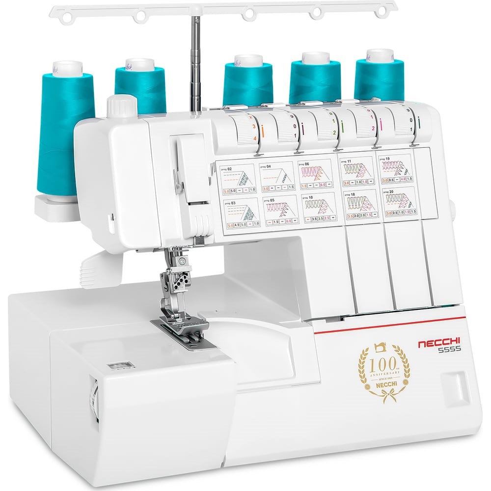 Пятиниточный оверлок (Коверлок) Necchi 5555 совмещает в себе оверлочную и плоскошовную машину. Обработка тканей с профессиональным результатом. Переход с оверлочных строчек на плоские занимает меньше одной минуты. Пользователь может выбирать любую строчку из 20 заложенных программ. Встроенный дифференциал и регулятор давления лапки позволяют работать со всеми видами стрейч-тканей, трикотажем и джинсой. Мощный двигатель 120W позволит обрабатывать ткани с высокой скоростью.20 видов плоских и оверлочных строчек12 оверлочных строчек8 плоских строчекВстроенный дифференциалДвойная светодиодная подсветкаЦветная система заправкиСъемные прижимные лапкиОтключаемый верхний ножМеталлическая станинаШирина строчки 3-8,5 ммНабор аксессуаров в комплектеМощность двигателя 120 ВтСкорость шитья – 1300 стежков в минутуВес нетто - 8,5 кг, брутто - 10,2 кгРазмер машины 34х27х30 смРазмер коробки 44х34,5х37 см