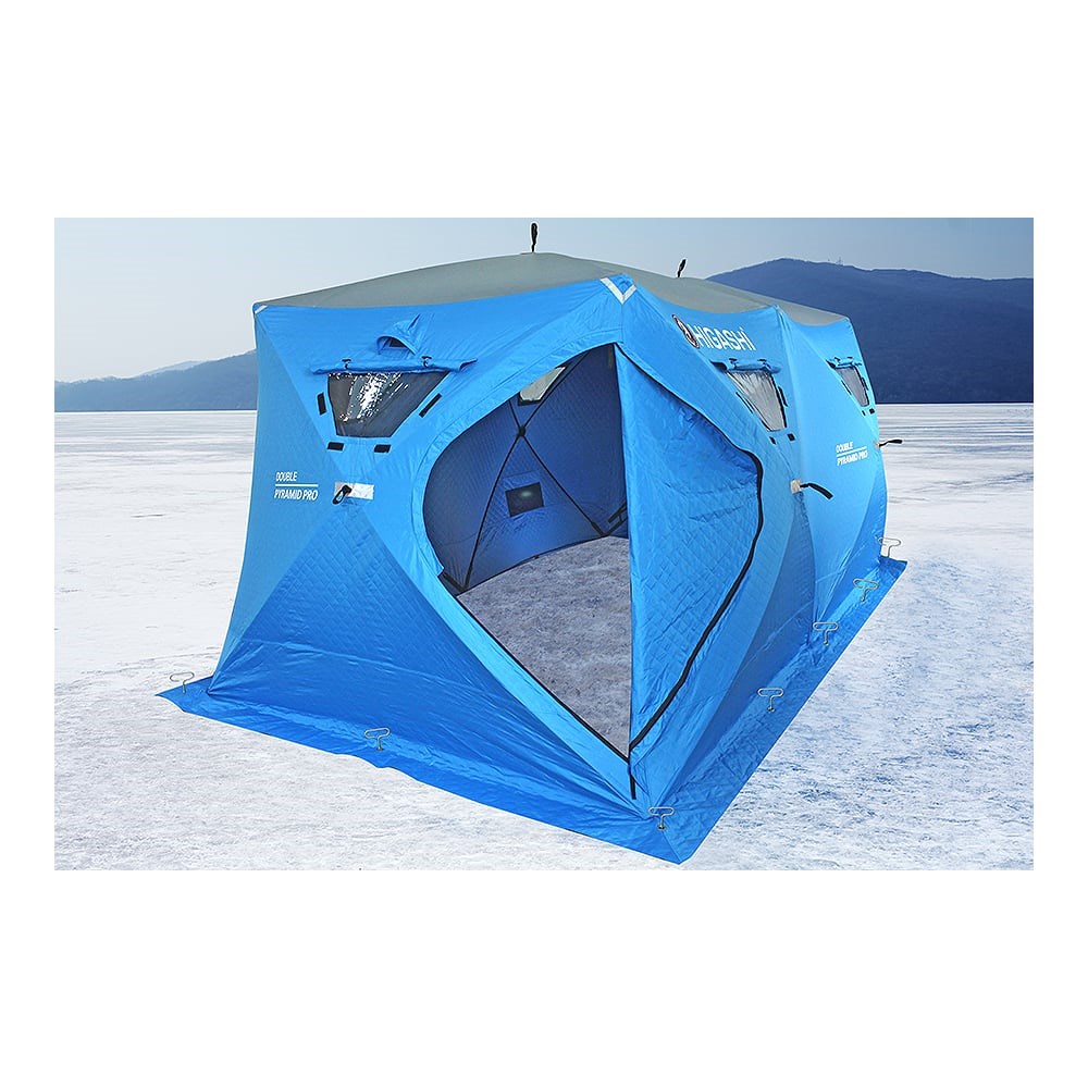 Палатка HIGASHI Double Pyramid Pro 03515 – сдвоенная утепленная трапециевидная зимняя модель. Оснащена шестью съемными смотровыми окнами, закрывающимися дополнительными тканевыми клапанами. Вентиляционные отверстия находятся под потолком и снабжены специальными клапанами. Предусмотрено четыре сетчатых кармана для хранения необходимых рыболовных аксессуаров. Наличие светоотражающих элементов обеспечивает безопасность нахождения на льду в темное время суток. Благодаря конструктиву палатки, основанному на восьми хабах и дугах, установка/сборка в пределах полутора минут. Палатка выполнена из материала NYLON 300D THERMAL, с показателем водонепроницаемости 1000 мм в. ст. Комплектуется удобным чехлом с эргономичными дополнительно усиленными наплечными лямками для хранения и транспортировки. Имеются крючки для крепления осветительных приборов.