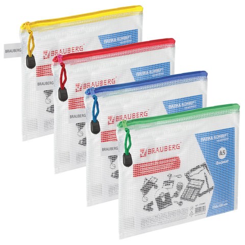 Папка-конверт на молнии МАЛЫЙ ФОРМАТ (238х180 мм) А5, молния ассорти, ПВХ, прозрачная, BRAUBERG "Segment", 223887