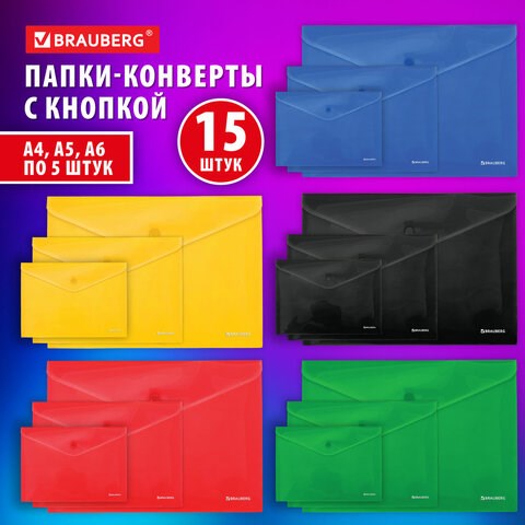 Папка-конверт с кнопкой КОМПЛЕКТ 15 шт., А4, А5, А6 по 5 шт., цвета ассорти, BRAUBERG, 0,18 мм, 272867