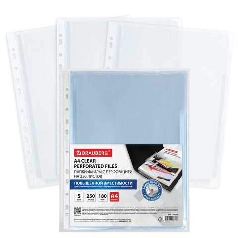 Папки-файлы перфорированные БОЛЬШОЙ ВМЕСТИМОСТИ до 250 листов, A4, КОМПЛЕКТ 5 шт., 180 мкм, BRAUBERG, 224315