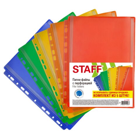 Папки-файлы с перфорацией БОЛЬШОЙ ВМЕСТИМОСТИ до 250 листов, ЦВЕТНЫЕ, А4, КОМПЛЕКТ 5 шт., STAFF, 274081