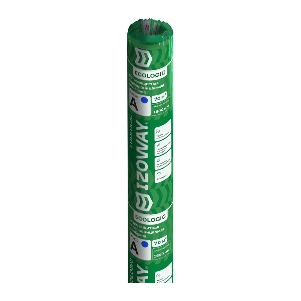 Ветрозащитная паропроницаемая мембрана Izoway A ECO 70 кв. м 17047 предназначена для защиты утеплителя, строительных конструкций и внутренних элементов крыш и стен от ветра, влаги, а также подкровельного конденсата в зданиях различного типа. Внешняя сторона имеет гладкую водонепроницаемую поверхность, внутренняя сторона имеет шероховатую структуру, за счет которой удерживает конденсат и позволяет ему испаряться. Помогает значительно улучшить теплозащитные характеристики утеплителя и увеличить срок службы конструкции. Ветрозащитная паропроницаемая мембрана IZOWAY A применяется для: Утепленной скатной кровли Стен зданий с наружным утеплением Вентилируемых фасадов