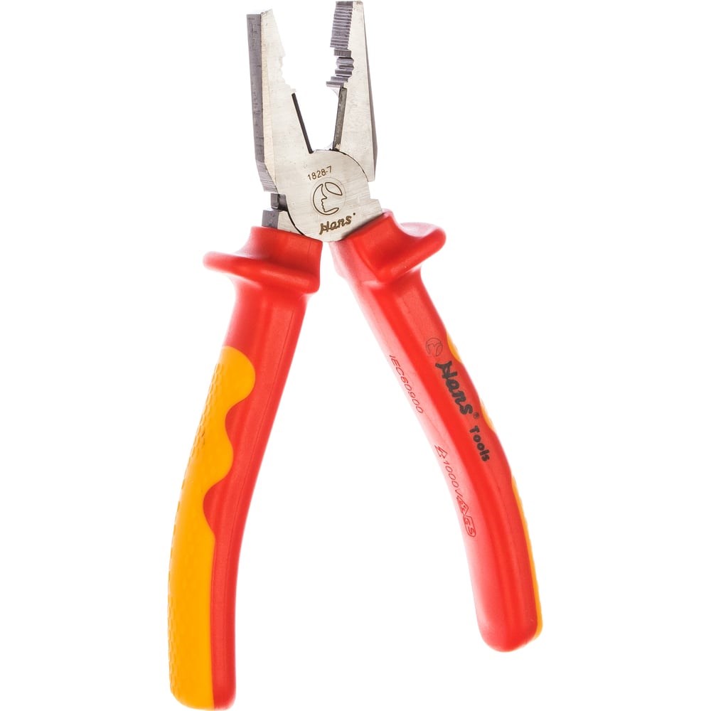 Пассатижи для электрика Hans 1828-07 - диэлектрические плоскогубцы с удобными рукоятками из двухкомпонентного материала с противоскользящим эффектом и специальными упорами для ладони. Максимальный диаметр прутка равен 1.6 мм. Захватные части изготовлены из прочной хромованадиевой стали и имеют зубчатые поверхности. Инструмент безопасен в эксплуатации под напряжением до 1000 В.
