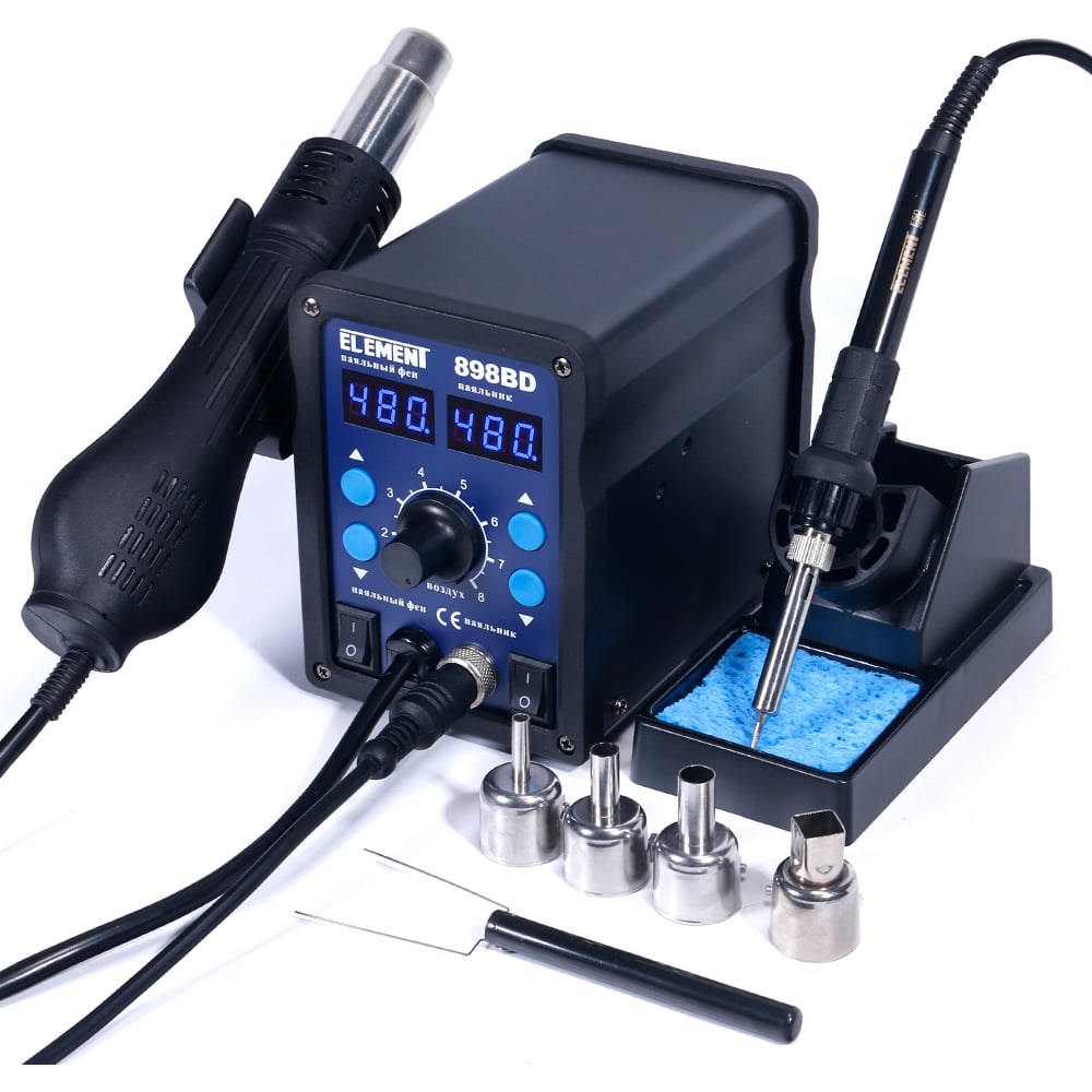 Паяльная станция, фен+паяльник ELEMENT 898BD 15297 отличается эргономичным исполнением, современным дизайном и небольшими размерами, за счет чего позволяет мастеру сэкономить пространство на рабочем месте. Устройство оборудовано микроконтроллером для цифрового отображения данных и возможности плавной регулировки температуры. Подходит для работы с различными компонентами в корпусах: PLCC, SOIC, BGA, QFP и т. д. Температура нагрева фена - 100-480°С.