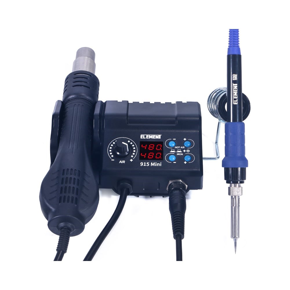 Дополнительные характеристики паяльной станции ELEMENT 915 Mini фен+паяльник 17660: Тип фена: турбинный. Скорость потока воздуха: 0-120л/мин. Температура потока воздуха: 100-480°С. Температура паяльника: 200-480°С.