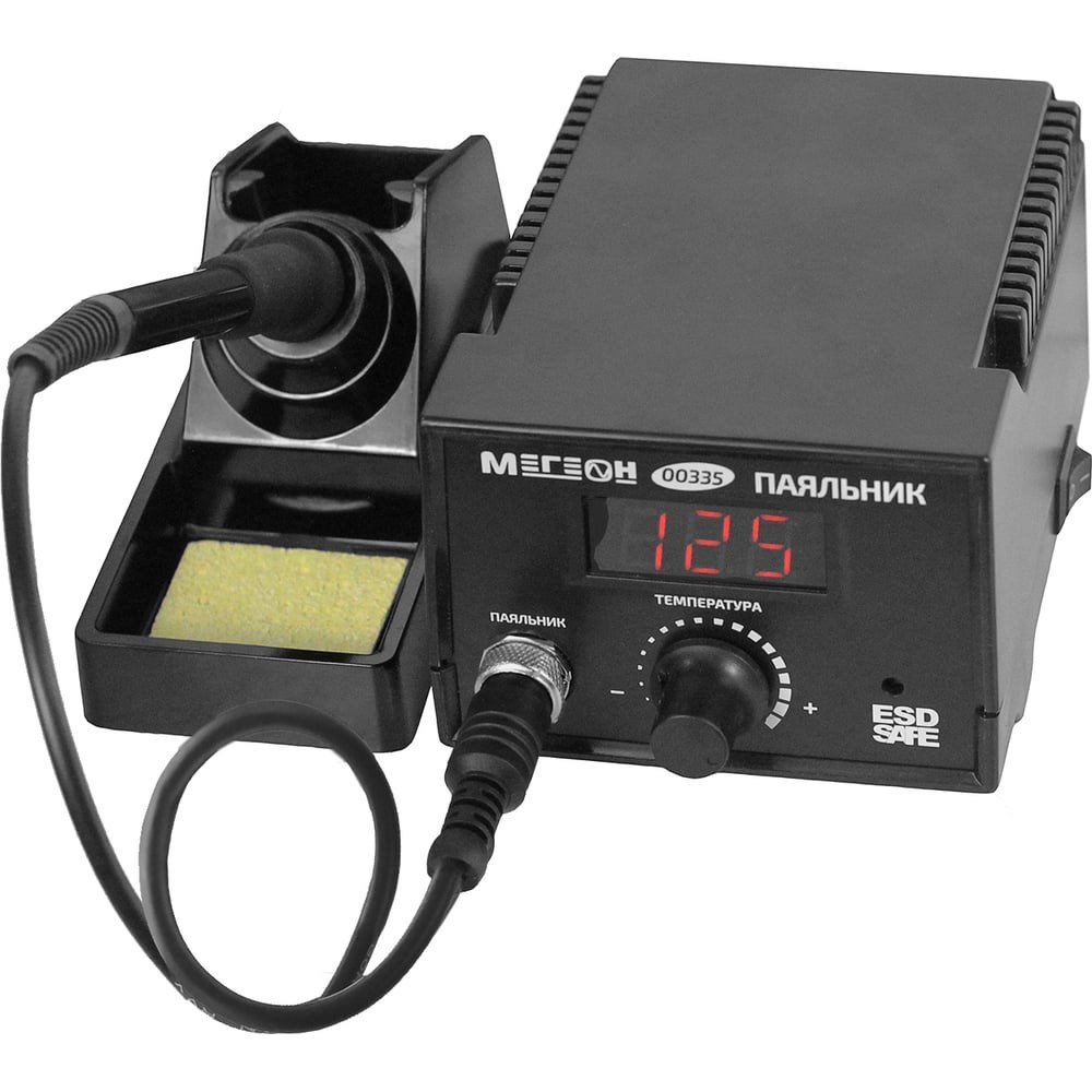 Паяльная станция МЕГЕОН 00335 – это удобный паяльник с ярким светодиодным дисплеем и аналоговым регулятором установки температуры. Немаловажным преимуществом при работе с паяльником является маленький вес, мягкий провод и компактные размеры блока управления. На рукоятке предусмотрена резиновая наклдака противоскольжения. Жало паяльника имеет распространённый типоразмер 900М-Т. Благодаря этому имеется большое количество сменных наконечников разной формы и размеров (в комплект не входят) для осуществления специфической пайки. В дополнение к написанному можно добавить ещё одно преимущество и это автоматическое поддержание установленной температуры паяльника. Для исключения повреждения радиокомпонентов статическим электричеством станция имеет фунцию антистатической защиты. Прибор по достоинству оценят профессионалы и любители.