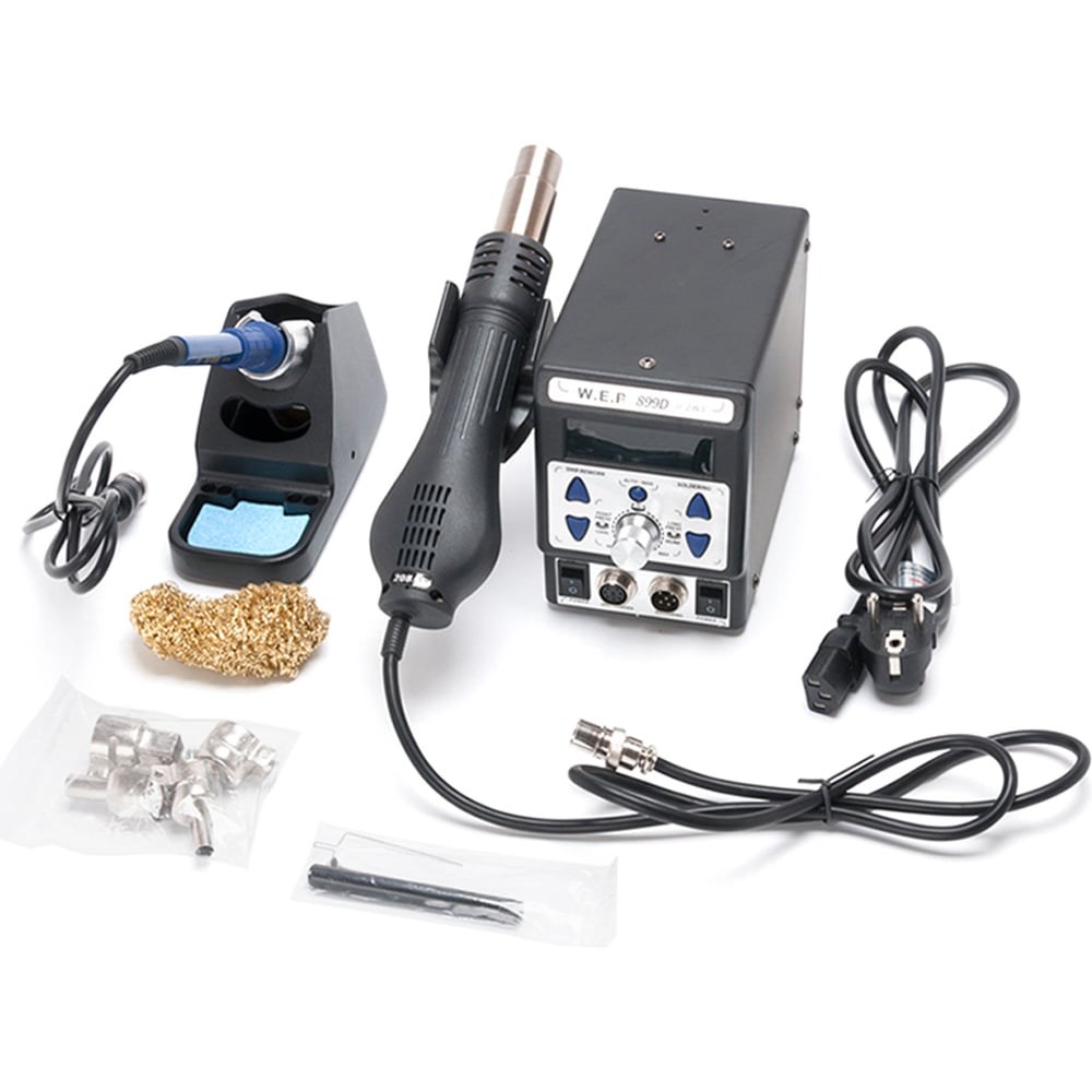 Паяльная станция W.E.P 899D-II М7748311 имеет два режима работы фена - ручной и автоматический. При выборе автоматического режима при установке на держатель фен начинает автоматически охлаждаться. После охлаждения он выключится. Эта функция позволяет продлить срок службы нагревательному элементу и обеспечивает безопасность. При выборе ручного режима при установке на держатель фен не начинает охлаждаться и продолжает работать. Тип фена: турбина. Скорость потока воздуха: до 120л/мин. Регулировка температуры: паяльник: 200-480°C / фен: 100-480°С. Стабильность температуры: ± 1°С. Нагревательный элемент паяльника с сопротивлением 43-52 Ом, представляет собой керамику Hakko.