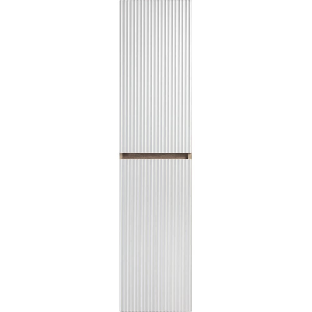 Шкаф пенал для ванной комнаты RUNO МОДЕНА (подвесной) – это изысканность и утончённая роскошь в интерьере. Волнистые рифленые фасады визуально «оживляют» и «приводят в движение» всю обстановку комнаты, сохраняя при этом умиротворение и покой, превосходно сочетаются с древесной фактурой и текстурой необработанного натурального камня корпуса. Цвет корпуса в двух цветах: текстура светлого дерева или необработанного натурального камня. Цвет фасада классический – белый глянец, идеально впишутся в любой интерьер ванной комнаты. Шкаф в ванную комнату оснащён двумя распашными дверцами, в каждом отделении по одной встроенной полке. Каждая дверца укомплектована двумя петлями, верхняя с доводчиком, нижняя без доводчика. Мебель для ванной RUNO - красота и практичность в мелочах, шкаф пенал для ванной комнаты Модена – лучший выбор для ванной комнаты!