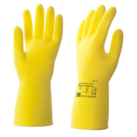 Перчатки латексные КЩС, сверхпрочные, плотные, хлопковое напыление, размер 7, S (малый), желтые, HQ Profiline, 73581
