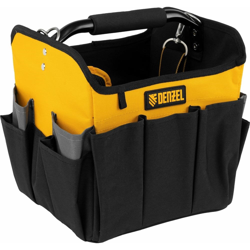 Переноска для инструмента Denzel 260x240x300 мм, 22 кармана, наплечный ремень 90294 предназначена для транспортировки и хранения ручного инструмента. Множество внешних и внутренних карманов удобны для быстрого доступа к нужному инструменту, а также позволяют оптимизировать пространство переноски. Переноска оснащена стальной рукояткой с неопреновой круглой накладкой, а также плечевым ремнем с возможностью регулировки длины (широкая подвижная накладка для удобства). Данная модель удобна, как при выездных работах, так и для хранения инструмента, например, дома, в машине, на даче или в гараже. Материал переноски - плотный полиэстер (600 D), устойчивый к истиранию. Конструкция сумки усилена боковым каркасом. На дне сумки с внешней стороны установлены пять пластиковых сферических подставок. В случае необходимости, стальные карабины на плечевом ремне позволяют быстро отсоединять его от переноски. Длина плечевого ремня 1350 мм.
