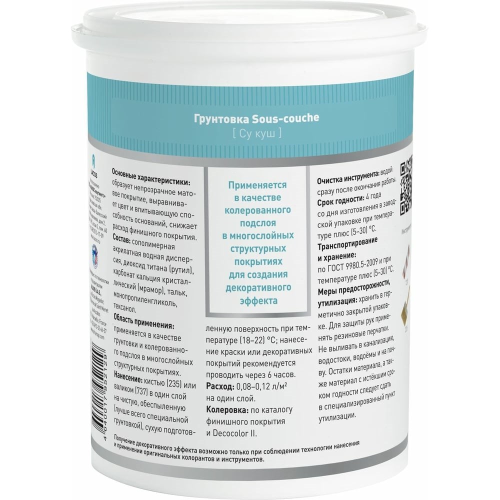 Грунтовка для декоративных покрытий L’impression Sous-couche 2.5 л, пигментированная, цвет 32090 TGPCQD6NXK образует непрозрачное матовое покрытие, выравнивает цвет и регулирует впитывающую способность оснований, снижает расход финишного покрытия. Экологически безопасна, не содержит органических растворителей Применяется и колеруется в цвет финишного покрытия с материалами: Ле Перль, Перль Эксэлянт, Сабле. Применяется по бетонным, асбестоцементным, цементно-стружечным, оштукатуренным (кроме известковых штукатурок), зашпатлёванным (кроме масляных шпатлевок), гипсокартонным и гипсоволокнистым поверхностям, по бетонным плитам и кладке из керамического кирпича. Подготовленная поверхность должна быть чистой, сухой, а её качество соответствовать категории К3 или К4 по СП 71.13330.2017 в зависимости от финишного декоративного покрытия. Применяется также в качестве колерованного подслоя в многослойных структурных покрытиях. Состав: сополимерная акрилатная водная дисперсия, диоксид титана (рутил), карбонат кальция кристаллический (мрамор), тальк, монопропиленгликоль, тексанол. Расход: 0,08-0,125 л/м2. Наносится в 1 или 2 слоя. Продукт готов к нанесению, не разбавлять.