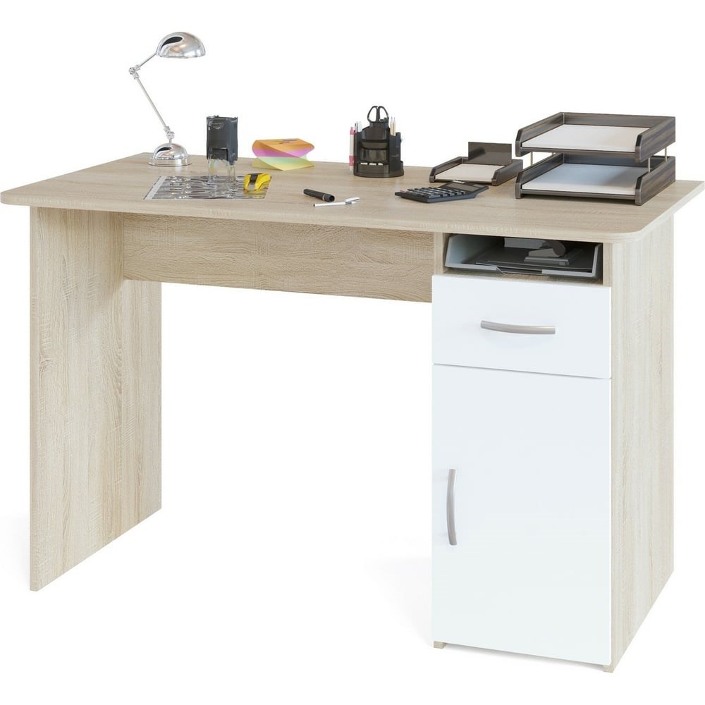 Письменный стол СОКОЛ с тумбой дуб сонома/белый СПм-03.1 СПм031С5б6 шириной 1200 мм со встроенной тумбой. Просторная столешница позволит удобно расположиться за столом и работать с большим объемом документов. Тумба оснащена открытой нишей, выдвижным ящиком и закрытой полкой. Внутренний размер ящика составляет 382 х 223 мм, что позволит разместить в нем документы формата А4, канцелярские принадлежности и необходимые мелочи. Стол универсален при сборке (вы можете расположить тумбу как справа, так и слева). Стол изготовлен из высококачественного ламинированного ДСП российского производства толщиной 16 мм, края столешницы скруглены и отделаны противоударным кромкой ПВХ. Задняя стенка сделана из ДВП серого цвета. Изделие поставляется в разобранном виде. Хорошо упаковано в гофротару вместе с необходимой фурнитурой и подробной инструкцией по сборке. Простой строгий стол прекрасно впишется в интерьер комнаты или офиса.