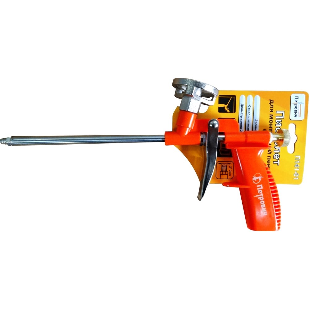 Пистолет для монтажной пены с пластмассовым корпусом Петрович П141-01 4100014458 применяется для нанесения монтажной пены при установке окон, дверей, различных элементов строительных конструкций. Длинный носик легко проникает в труднодоступные места. Диаметр сопла 2 мм, длина 230 мм.