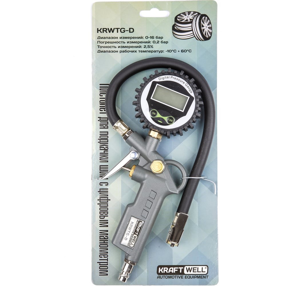 Пистолет для подкачки шин с цифровым манометром KraftWell KRWTG-D предназначен для применения в шиномонтажных мастерских, станциях технического обслуживания автомобилей и мототехники, а также для автолюбителей. Манометр с ЖК дисплеем с подсветкой в обрезиненом корпусе Автоматическое отключение дисплея в режиме ожидания Кнопка вкл/выкл и выбора единиц измерения Кнопка включения подсветки и обнуления показаний Иконка заряда элемента питания Высокая точность измерений Быстросъемное соединение для подключения к линии сжатого воздуха Наконечник с фиксатором Удобная кнопка спуска давления Диапазон давления - 0-15 бар / 0-220 psi / 0-1500 kPa Погрешность измерений - 0,2 бар Диапазон рабочих температур: от -10 до +60 градусов