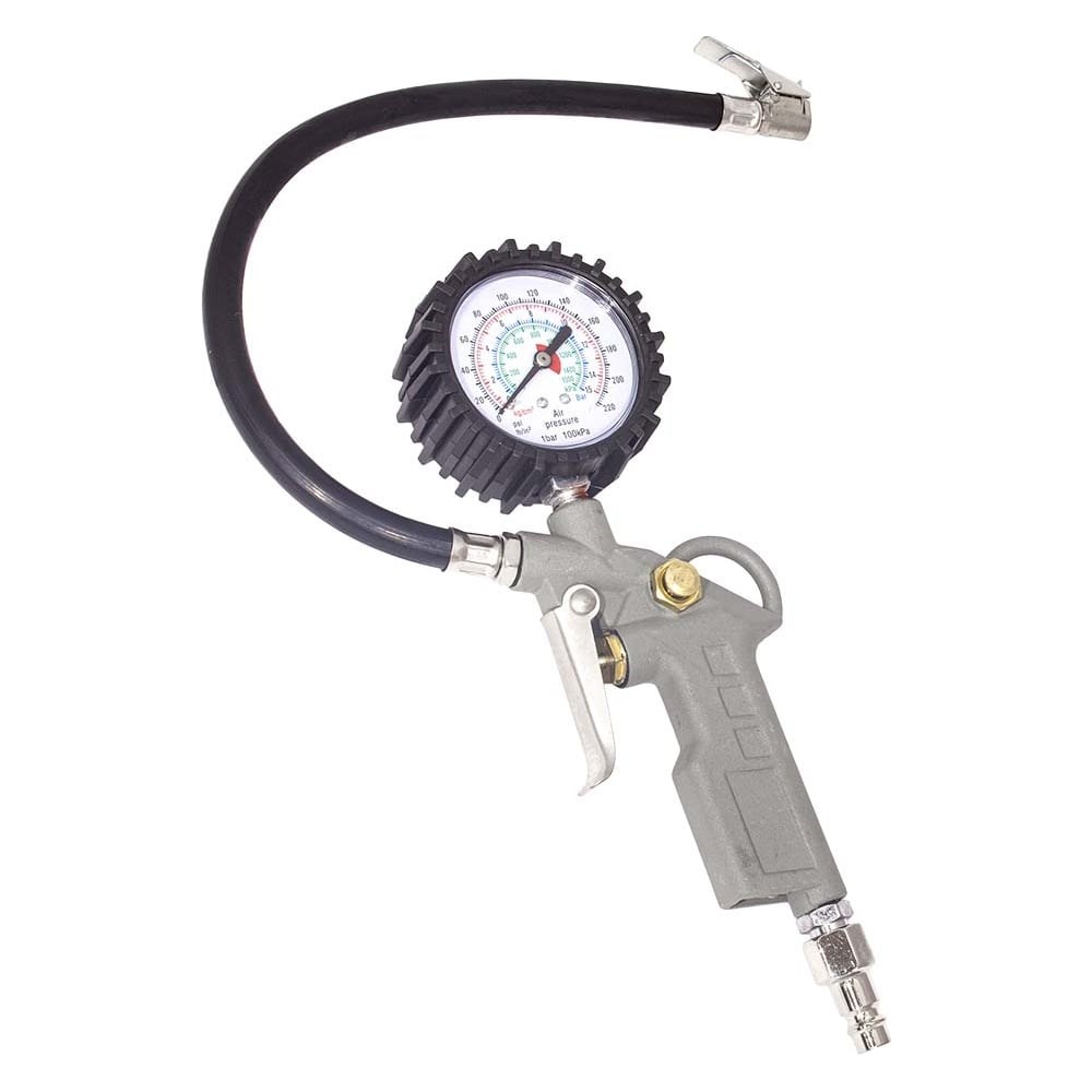 Пистолет для накачки шин с манометром PI TOOLS 7471 предназначен для накачки шин легковых автомобилей, мототехники и велосипедов. Получил широкое распространение в автосервисах и шиномонтажах.Модель оснащается гибким шлангом длиной 350 мм для работы в труднодоступных местах. Сбоку на рукоятке есть кнока сброса давления.Корпус приспособления изготавливается из алюминиевого сплава, что придает конструкции прочность, легкость и износоустойчивость.